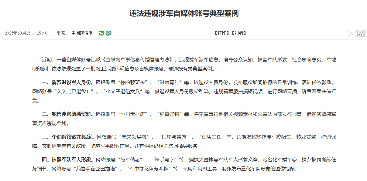 IT之家 10 月 15 日消息,近期,一些自媒体账号违反《互联网军事信息传播管理办法》,违规发布涉军信息,误导公众认知,损害军队形象,社会影响恶劣。