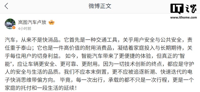 IT之家 10 月 15 日消息,岚图汽车科技股份有限公司董事长、总经理卢放今日发文: