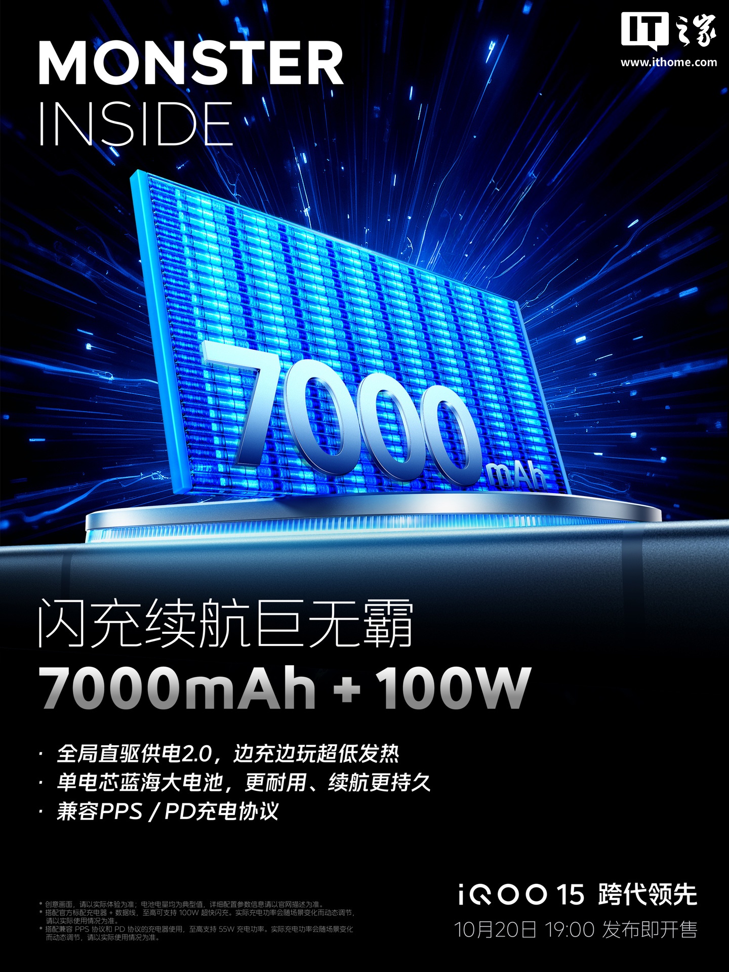 IT之家 10 月 15 日消息,iQOO 手机官方今日预热,iQOO 15 将搭载 7000mAh 蓝海大电池,确认支持 40W 无线充电 + 100W 有线超快闪充。此外,新机还兼容 PPS / PD 充电协议(至高支持 55W 充电功率)。
