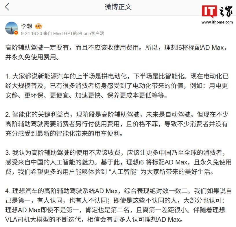 值得一提的是,李想此前还表示,高阶辅助驾驶一定要有,而且不应该收使用费用。他称现在不少高阶辅助驾驶需要消费者另行付使用费用,且价格不菲,导致不少消费者并没有充分感受到最新的智能化带来的用车便利,“我认为高阶辅助驾驶的使用不应该收费,应该让更多中国乃至全球的消费者,感受来自中国的人工智能的魅力。”