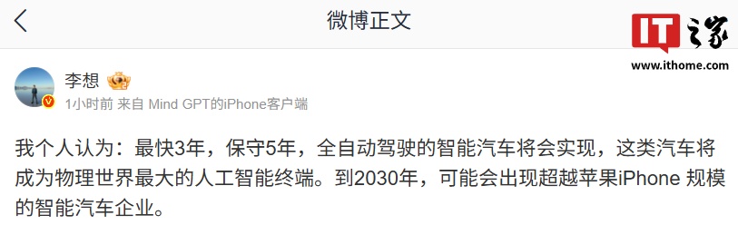 IT之家 10 月 15 日消息,理想汽车 CEO 李想今日发文表达了自己对于自动驾驶汽车发展的看法,他认为:最快 3 年,保守 5 年,全自动驾驶的智能汽车将会实现,这类汽车将成为物理世界最大的人工智能终端。到 2030 年,可能会出现超越苹果 iPhone 规模的智能汽车企业。