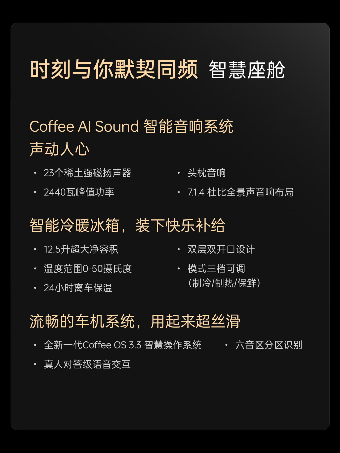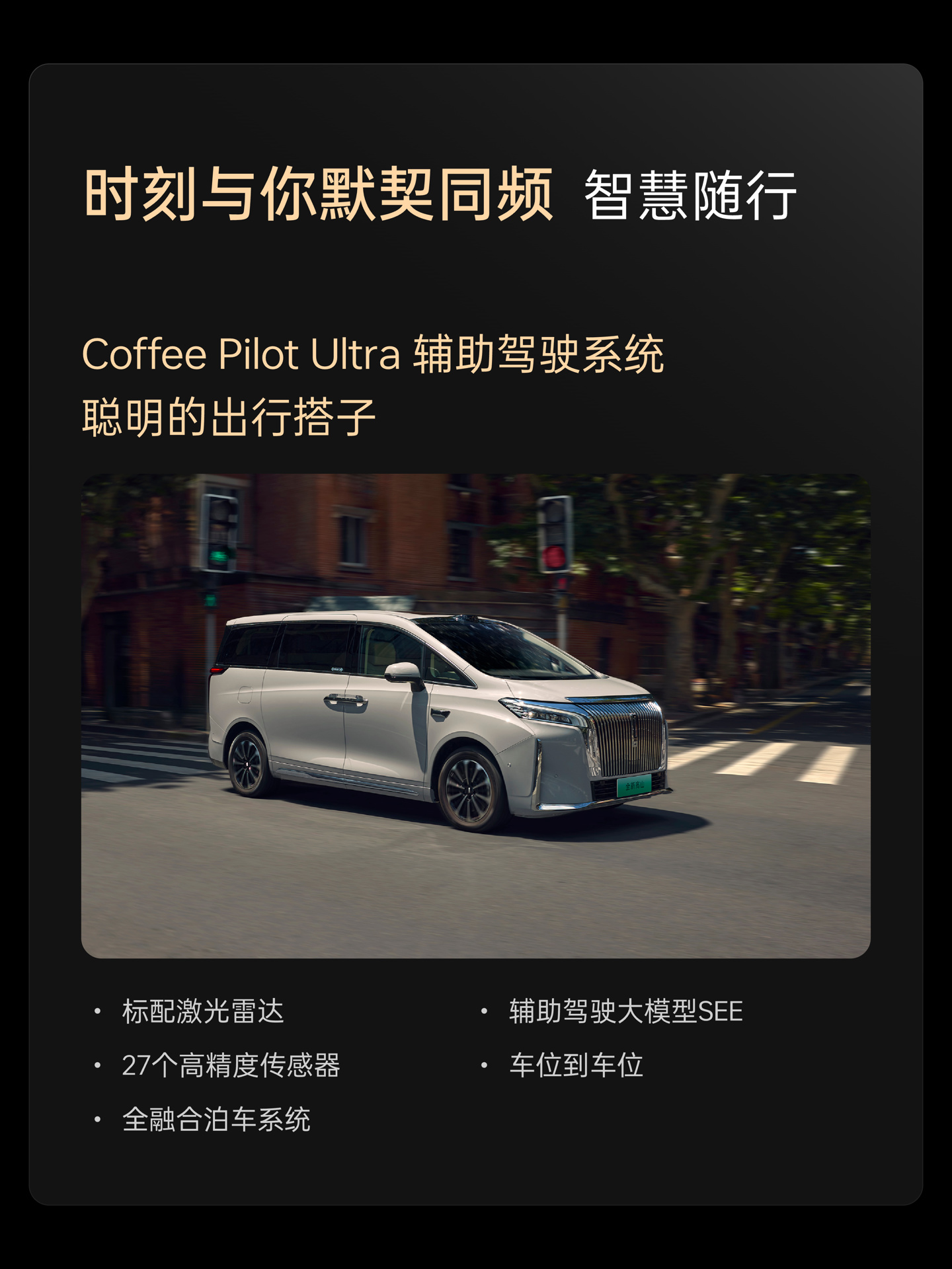 新车在车顶配备了激光雷达,将搭载 Coffee Pilot Ultra 智能辅助驾驶系统,支持高速和城市 NOA 以及智能泊车驾驶辅助功能。