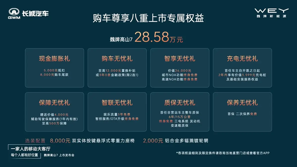 IT之家 10 月 15 日消息,今日晚间,魏牌高山 7 正式宣布上市,官方指导价 28.58 万元,福祉版 34.98 万元。新车定位为中大型 MPV,采用家族设计语言,搭载 Coffee Pilot Ultra 智能辅助驾驶系统。