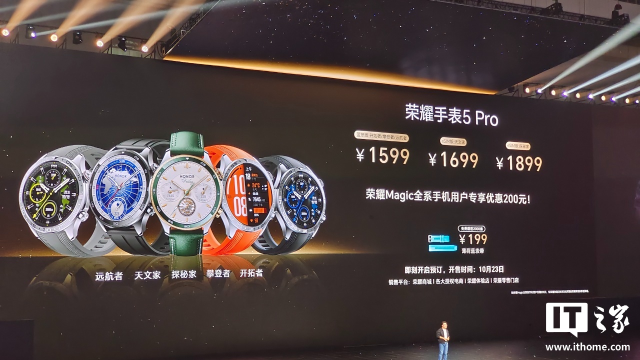 IT之家 10 月 15 日消息,荣耀今晚在北京举行“见新局・见未来”HGDC 发布会,推出荣耀手表 5 Pro,主打全面心脏健康防护、无感血压监测,拥有 eSIM 版本,售价 1599 元起。