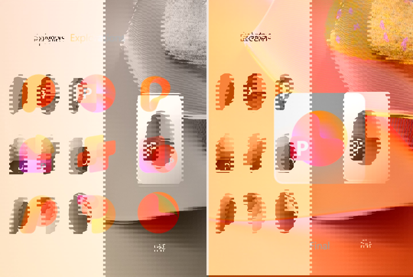 Excel 图标一直强调单元格的视觉元素,概念设计也沿用了这一思路。PowerPoint 图标始终以幻灯片为核心,微软此次则在新图标上尝试多种表现方式。一些概念突出字母设计,将 P 设计成丝带状或在 P 上挂上饼图。最终定稿的版本更保守,仅对现有图标做了稍微圆润和多彩化处理。