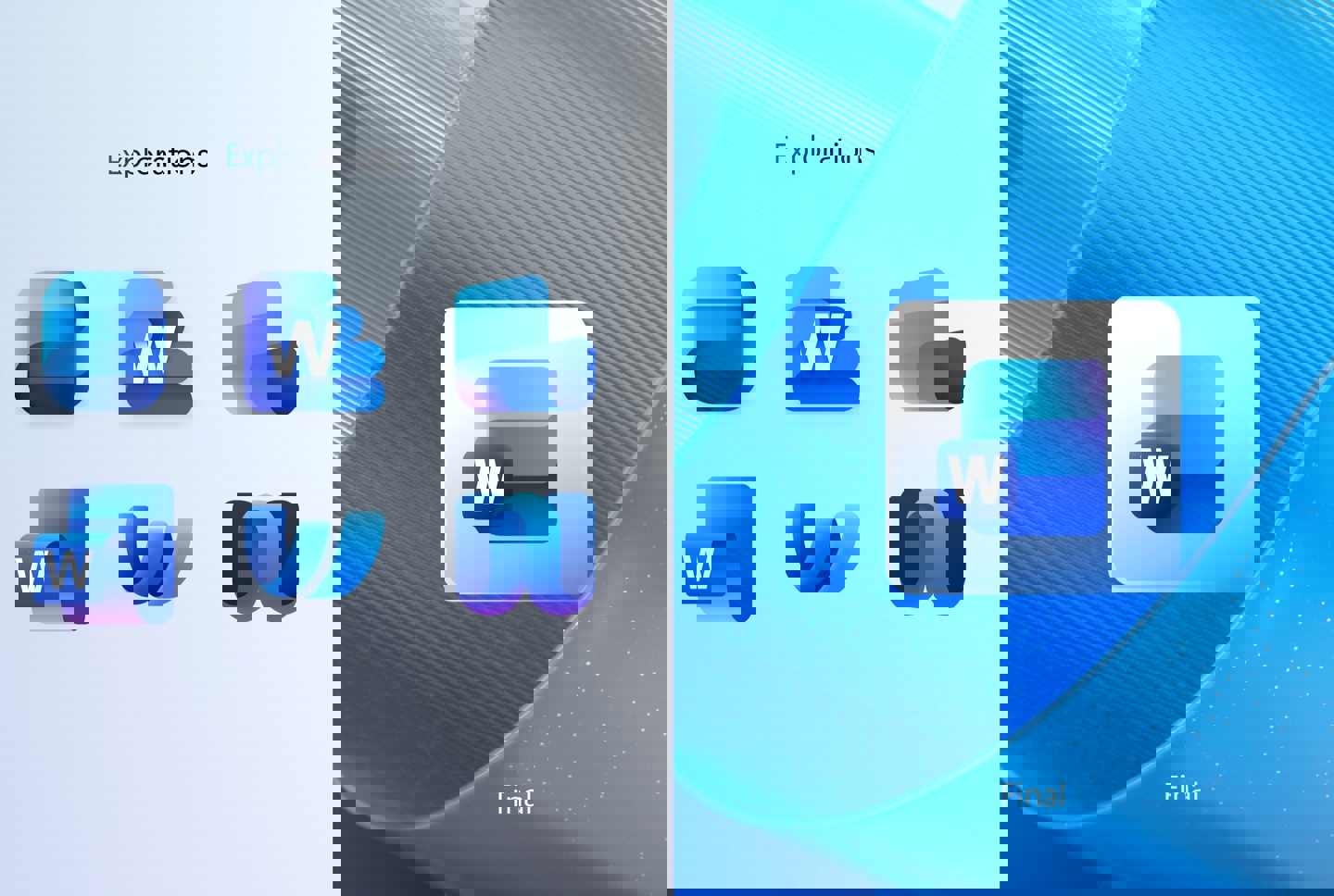 Word 的概念图标包括类似笔记本的设计,以及不同方式呈现文档或纸张堆的样式。微软曾尝试将 Word 字母作为图标主要元素,也尝试过字母融入图标或完全省略字母。最终微软选用了三条水平条的设计,并提供带字母和不带字母两种版本。