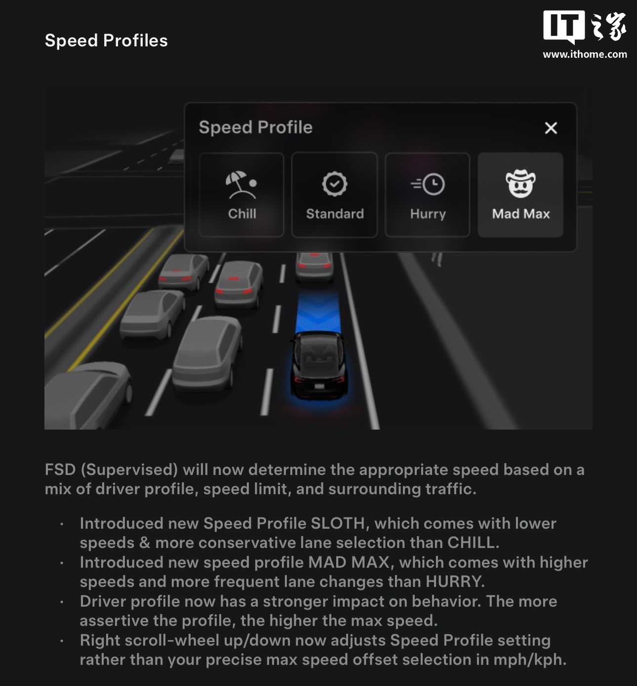 除了“疯狂麦克斯”模式,更新日志显示本次更新还引入了“树懒”(SLOTH)模式,相比“放松”(Chill)模式车速更慢,变道更不积极。