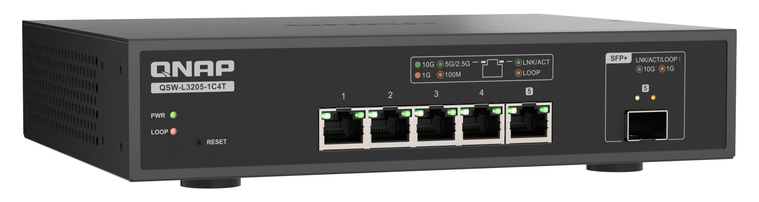 IT之家 10 月 16 日消息,威联通 QNAP 本月 14 日发布了面向小型工作室和创作者的轻网管型交换机新品 QSW-L3205-1C4T。这一全万兆型号包括 4 个 10GbE 多速率 RJ45 和 1 个 10GbE SFP+ / RJ45 二择一组合端口,总交换容量达 100Gbps。