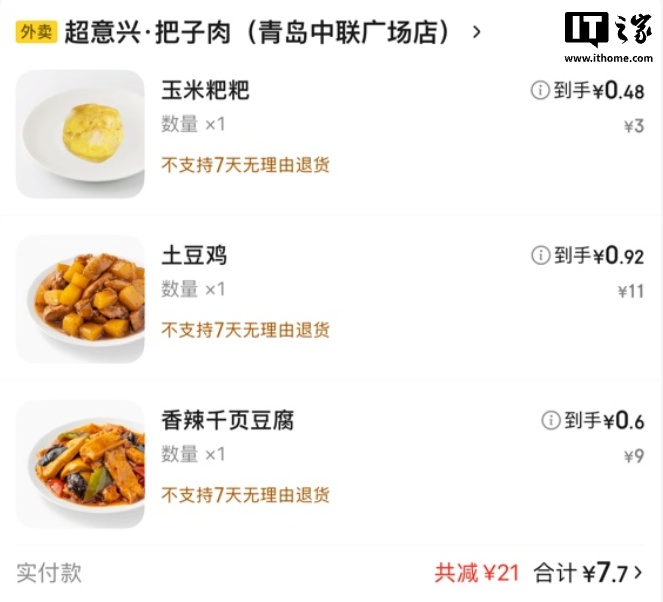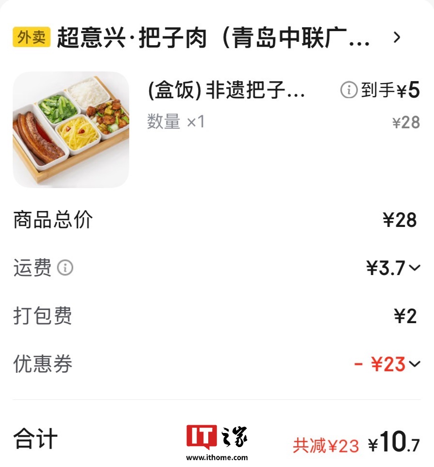 京东外卖部分地区补贴再加码,以山东口碑连锁快餐店“超意兴”为例,自动领店铺 17 元券 + 手动领 4 元叠加神券后,26 元套餐仅需 5 元 + 2 元包装费(部分地址还需运费)即可入手。