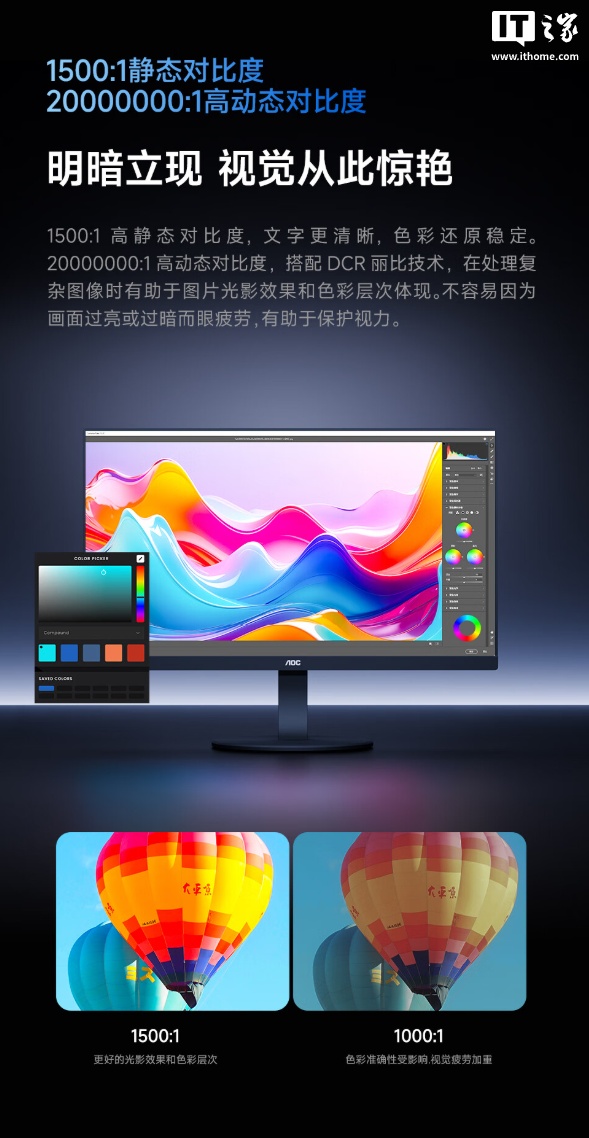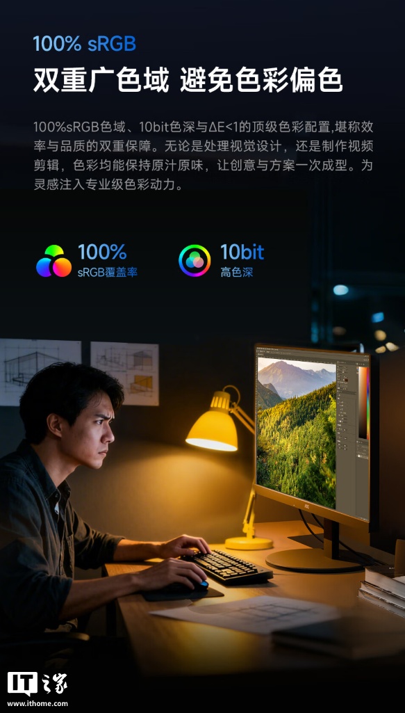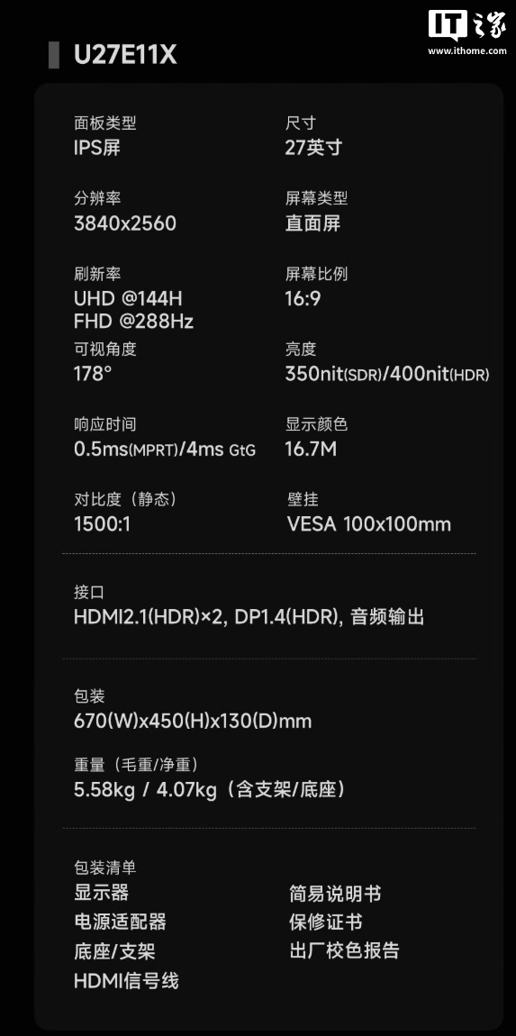 据介绍,这款显示器搭载 27 英寸 IPS 面板,可视角度可达 178°,可在 4K 144Hz 和 1080P 288Hz 模式间随心切换,匹配单机 3A 游戏和网络动作游戏,最高亮度可达 400 尼特,静态对比度达 1500:1,支持 100% sRGB 色域和 10bit 色深,ΔE<1,满足游戏之余的创作需求。