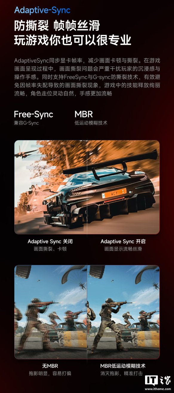 此外,这款显示器还支持电竞模式,开启后可针对不同游戏进行画质调校,可通过算法调节暗场、明暗部细节,还支持准心辅助、帧计数器等进阶功能,兼容 Free-Sync、MBR 技术,可防止画面撕裂。