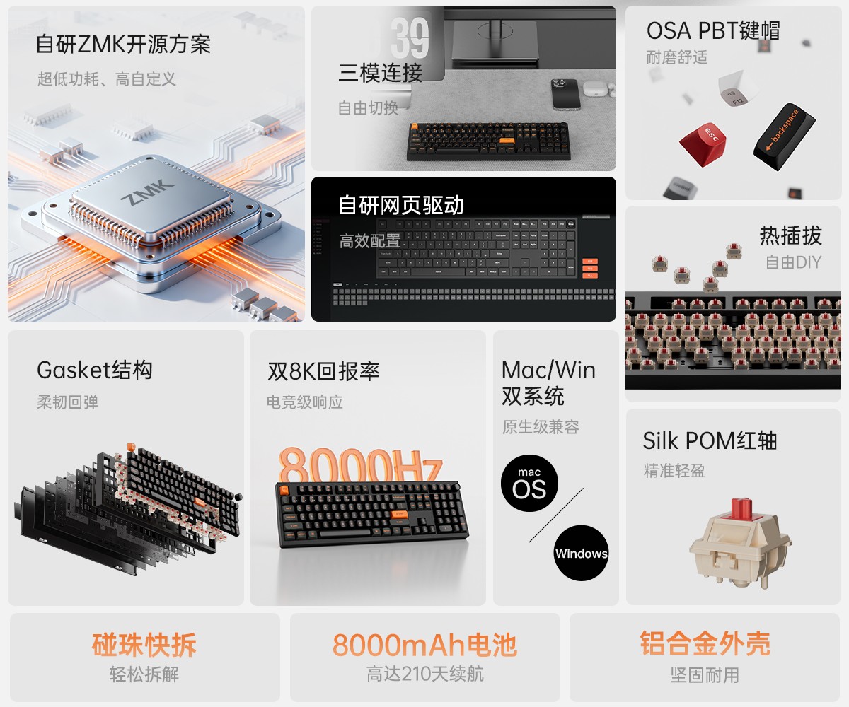 该键盘支持三模连接,其中有线 USB-C 和无线 2.4GHz 均支持 8kHz 回报率,而得益于 ZMK 低功耗方案 + 瑞昱 RTL8762G 系列芯片 + 8000mAh 的助力,其在蓝牙下使用续航可达 210 天。