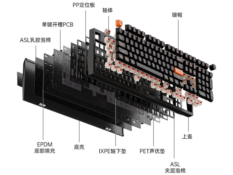 Keychron Z6 Ultra 采用碰珠快拆设计,内部为 Gasket 垫片固定结构,采用单键开槽 PCB 和 PP 定位板,拥有五层填充结构。