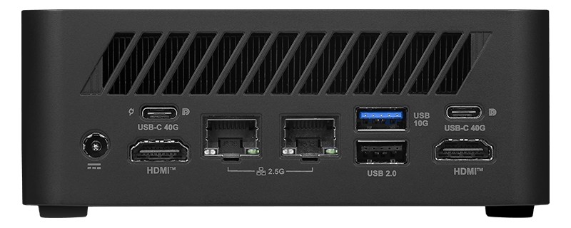 外部 I/O 接口方面,这款迷你主机正面提供了 4 个 USB-A 10Gbps、1 个 3.5mm 二合一音频插孔;反面则包含 2 个全功能 USB4、1 个 USB-A 10Gbps、1 个 USB-A 480Mbps、2 个 2.5GbE RJ45、2 个 HDMI 2.1 TMDS;左侧面还包含 1 个读卡器。