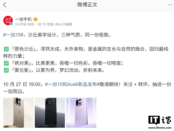 IT之家 10 月 17 日消息,一加 15 手机将于 10 月 27 日 19:00 发布,三款配色现已公布:原色沙丘、绝对黑、雾光紫,其中绝对黑行业首发「全哑丝绸玻璃」,3.7% 超低反射率;雾光紫行业首发「双维流光玻璃」,注入光敏材料,色彩随光而变。