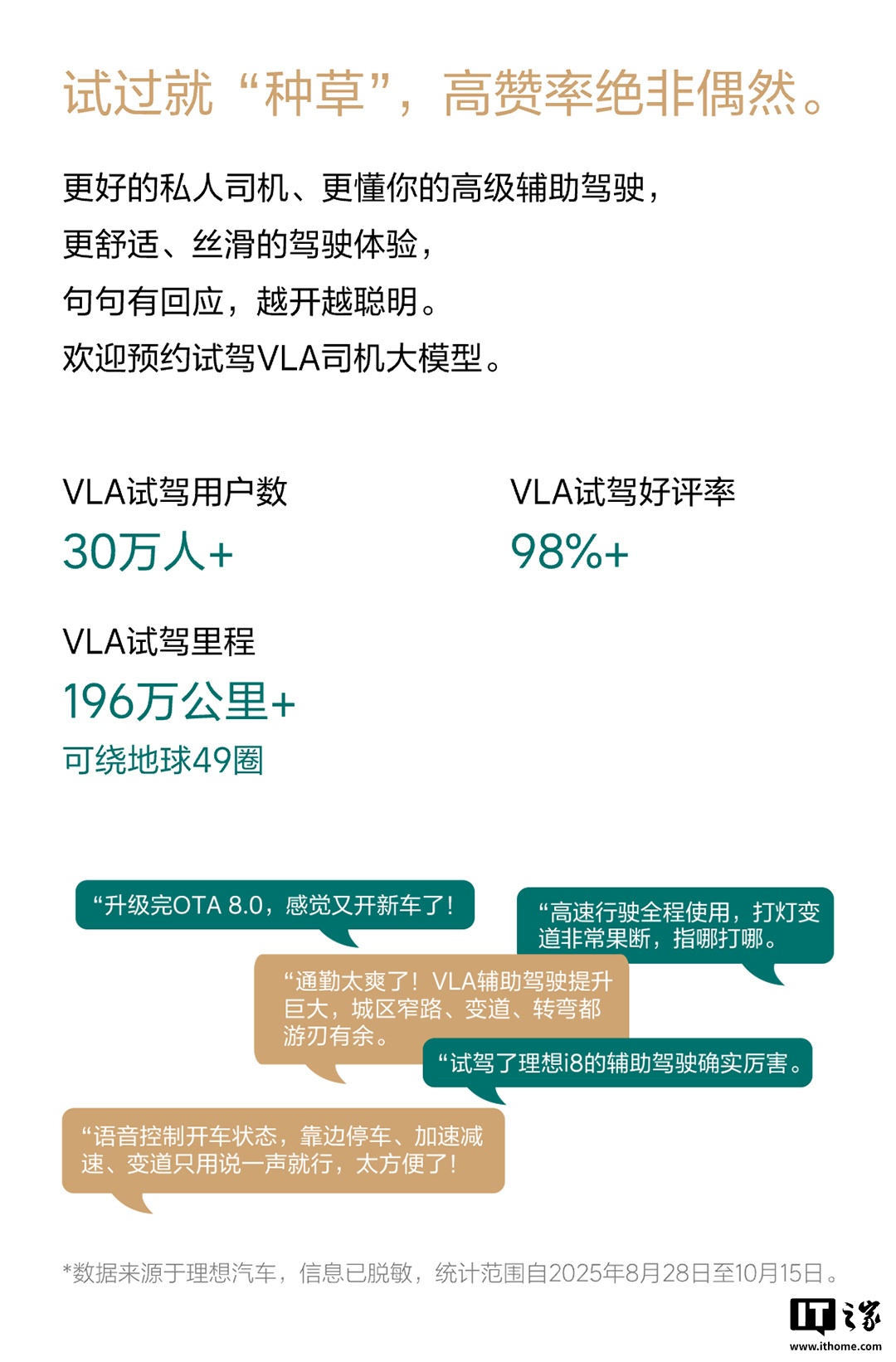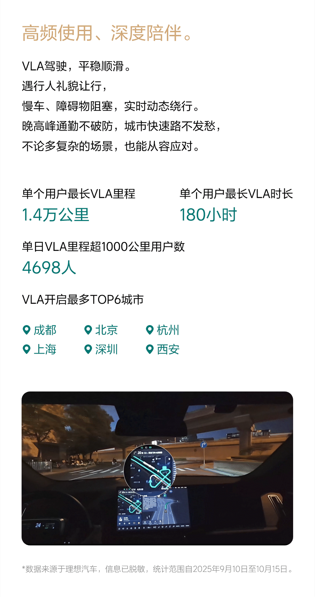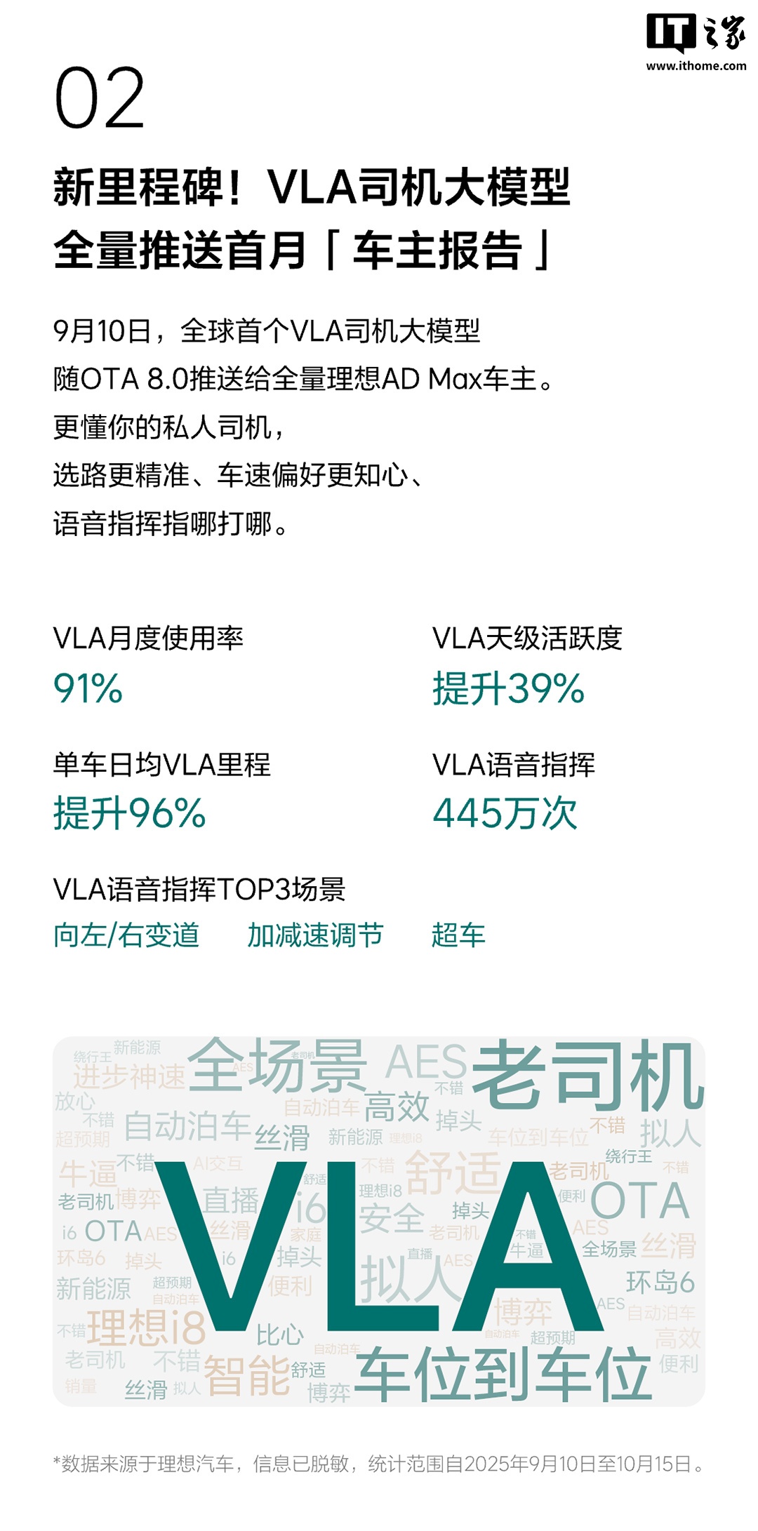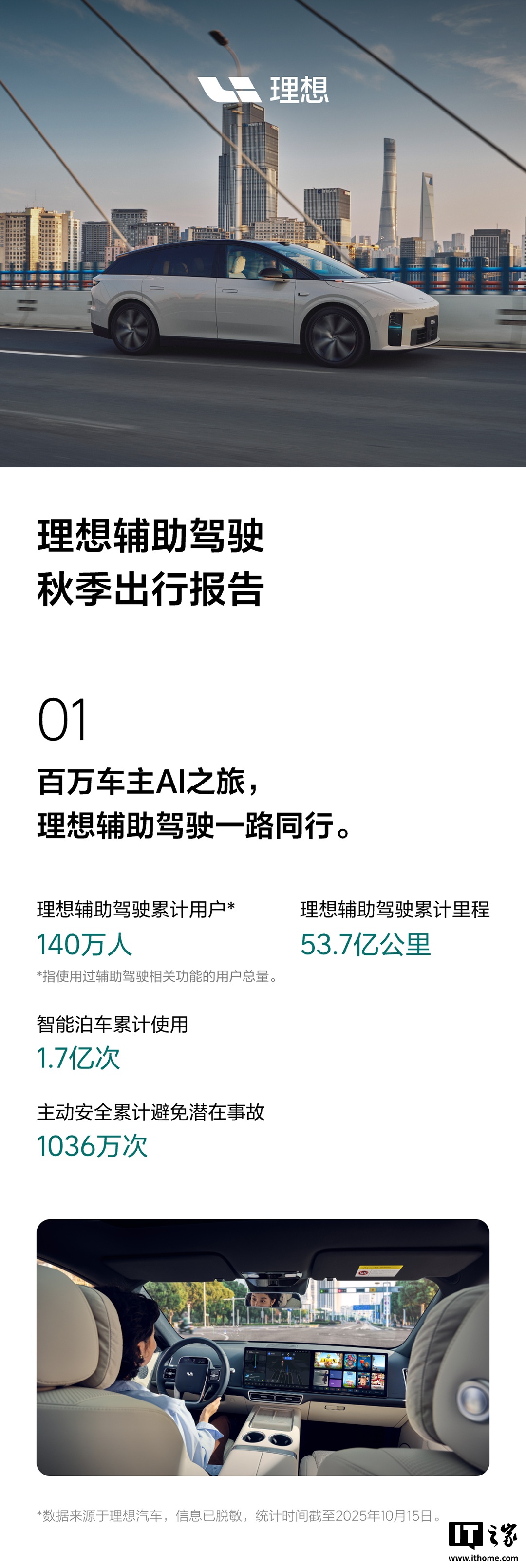 另外,理想汽车今日还发布了《理想辅助驾驶秋季出行报告》:截至 10 月 15 日,理想辅助驾驶累计里程 53.7 亿公里,主动安全累计避免潜在事故 1036 万次。自 9 月 10 日开启推送以来,VLA 司机大模型单车日均 VLA 里程提升 96%,VLA 语音指挥 445 万次,单个用户最长 VLA 里程 1.4 万公里。