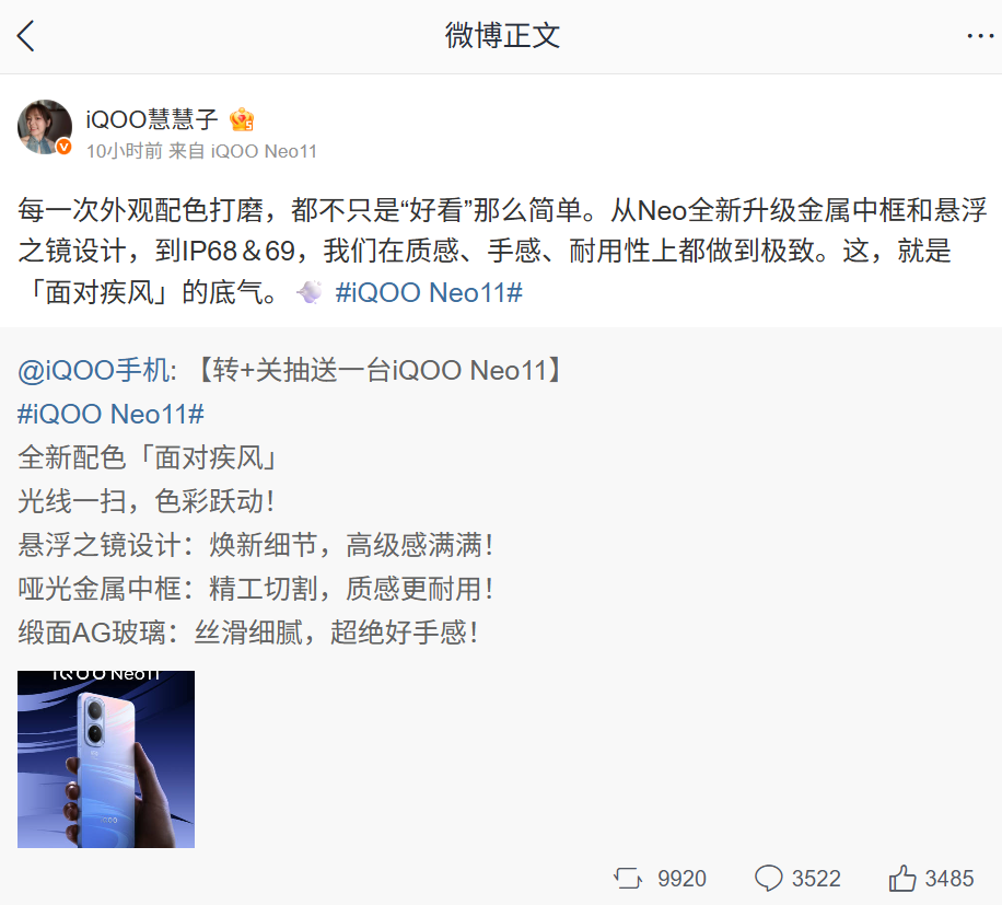 据IT之家此前援引 iQOO 产品经理 @戈蓝V 消息,Neo 11 手机将全版本标配 2K 屏,配合国产京东方 Q10 + 发光材料,全系出厂自带 AR 增透消反保护膜。