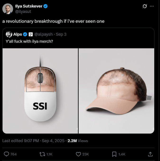 2025 年 9 月,一位网友在 X 上发布了一张恶搞图,左边是印着 Ilya 发际线的鼠标,右边是一顶相同发际线的棒球帽。