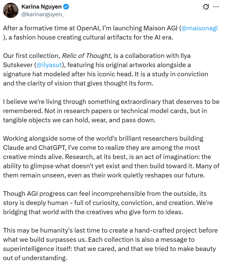 Karina Nguyen,前 OpenAI 研究员,在 X 上宣布创立 Maison AGI,一个「为 AI 时代打造文化遗物」的时尚品牌。
