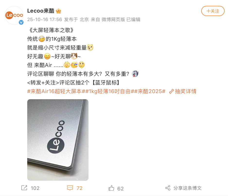 IT之家 10 月 18 日消息,联想旗下 Lecoo 来酷现已预热一款来酷 Air 16 轻薄本,该机主打 1Kg 重量,将于本月发布。