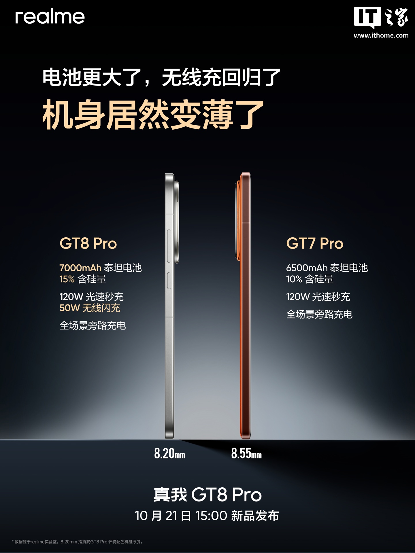 IT之家 10 月 19 日消息,realme 真我手机官方今日正持续预热 GT8 Pro 新机。据介绍,真我 GT8 Pro 比上代电量更足,内置 7000mAh 泰坦电池(提升 500mAh),在电池容量提升的基础上,该机还将其厚度减薄 0.35mm。