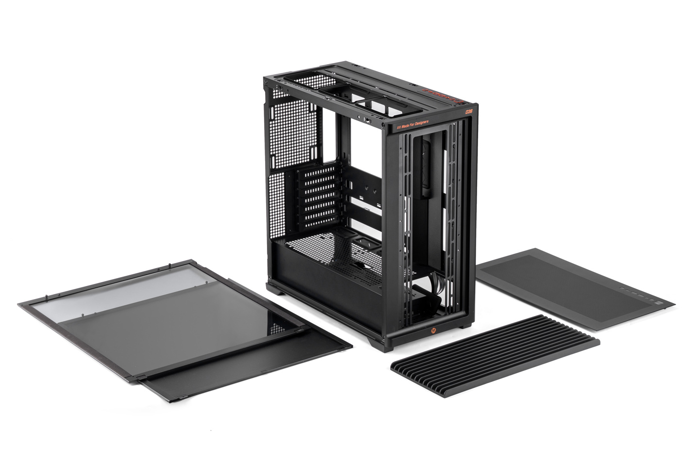 D36 本体三维 455×235×480 (mm),体积约 51.3L,采用 SPCC 钢板材质。其采用模块化快拆设计,前板采用磁吸安装、侧板则使用球形卡钉固定,均支持免工具拆装。