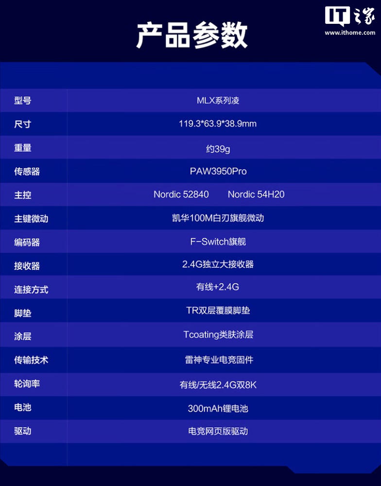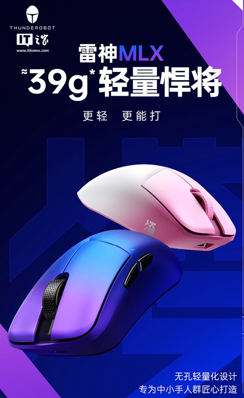 IT之家 10 月 20 日消息,雷神现已在京东上架一款 MLX 凌超轻量化游戏鼠标,该鼠标主打 39g 设计、匹配原相 PAW3950 Pro 芯片及 Nordic 52840 主控,定价为 329 元,首发价 299 元。
