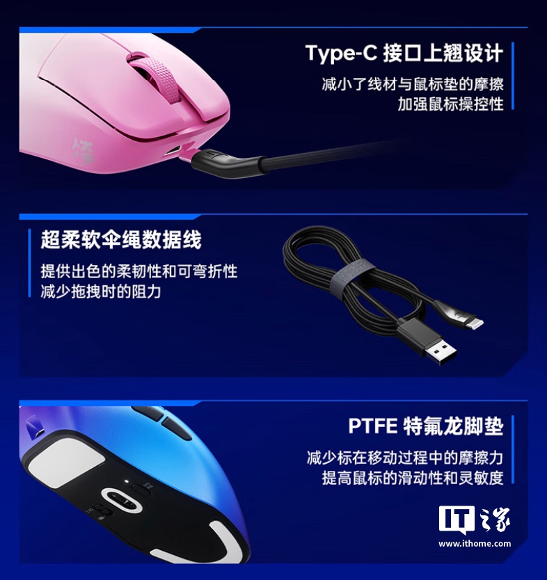 据介绍,该鼠标可选蓝粉双色,整体重量 39 克,使用非对称人体工程学模具,适用于中小手右手手型。