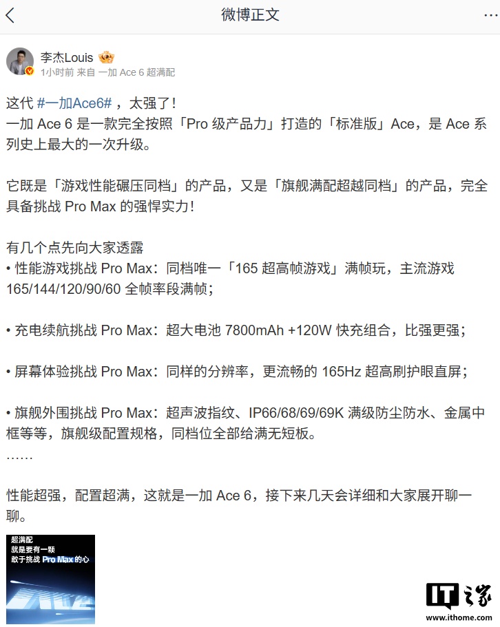 IT之家 10 月 20 日消息,一加中国区总裁 @李杰Louis 今日公布了一加 Ace 6 的部分规格,号称“Ace 系列史上最大的一次升级”,这款新机将于 10 月 27 日 19:00 发布。