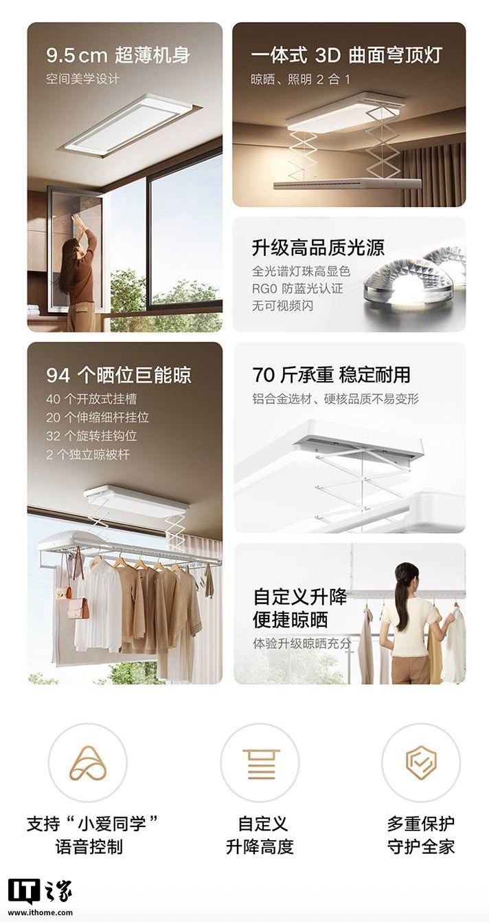 这款产品采用一体式 3D 曲面穹顶灯,内置 120 颗全光谱灯珠;配备低噪音直流电机,有着 9.5 cm 超薄隐藏机身;采用 6063 铝合金晾杆 + 304 钢丝绳,可承重 35kg,提供 94 个多功能晾晒位,具体包含: