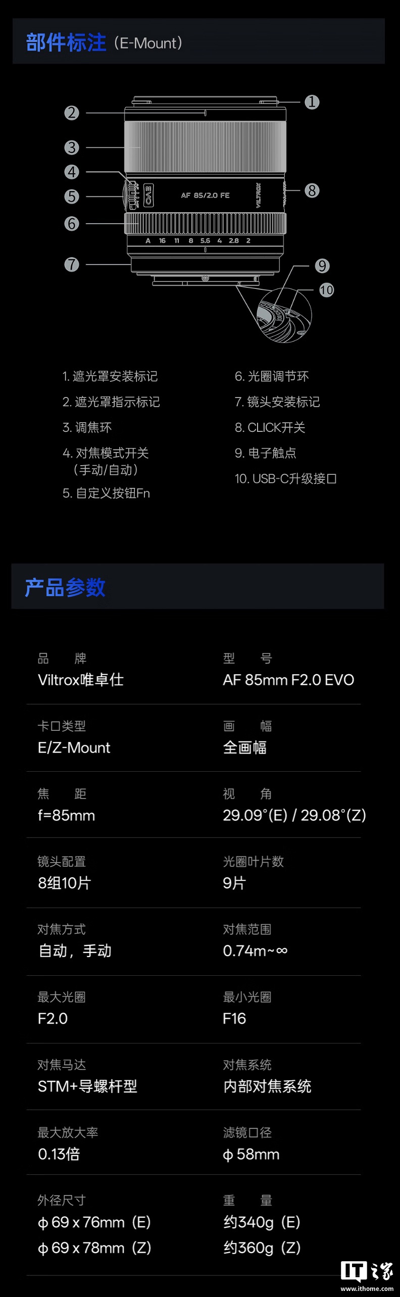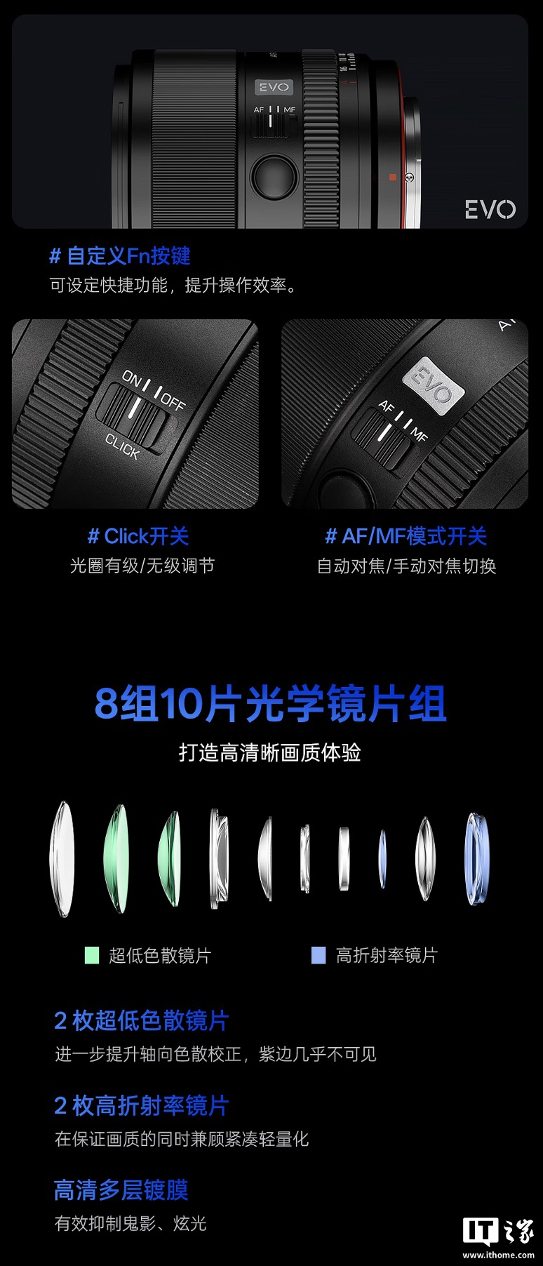 该镜头采用黑色配色,整体重量低至 340 克(E 卡口),机身带有 EVO 铭牌,整体重量 340 克,提供 Fn 自定义按键、光圈有级 / 无极开关、AF / MF 模式开关。