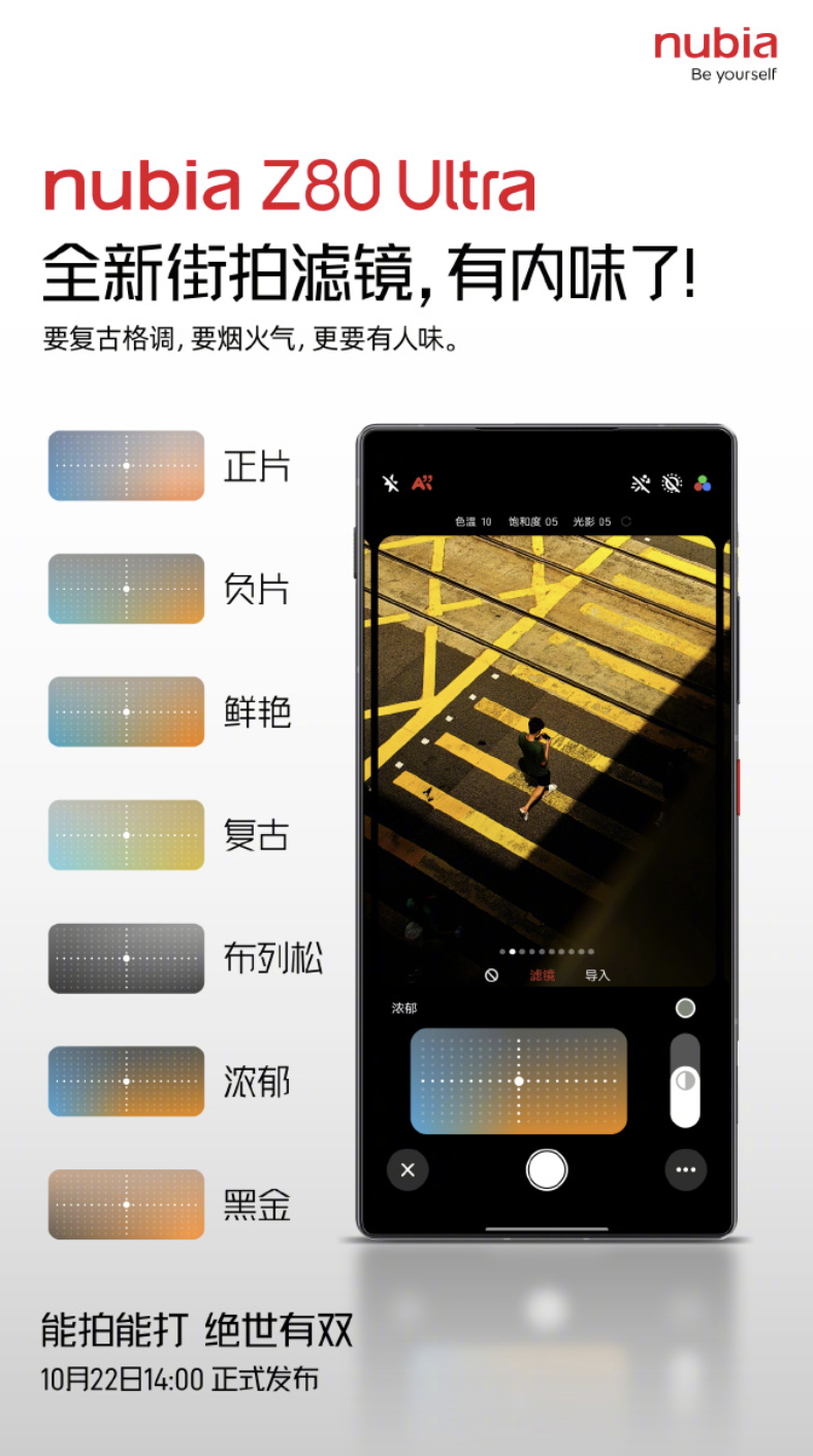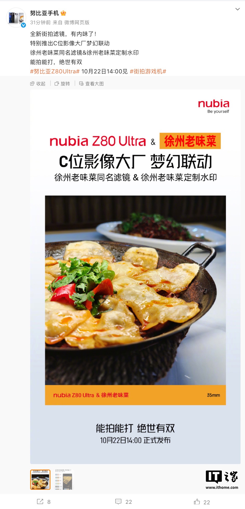IT之家 10 月 21 日消息,努比亚手机发文,透露努比亚 Z80 Ultra 手机将提供“徐州老味菜同名滤镜 / 徐州老味菜定制水印”,该机将于 10 月 22 日 14:00 发布。