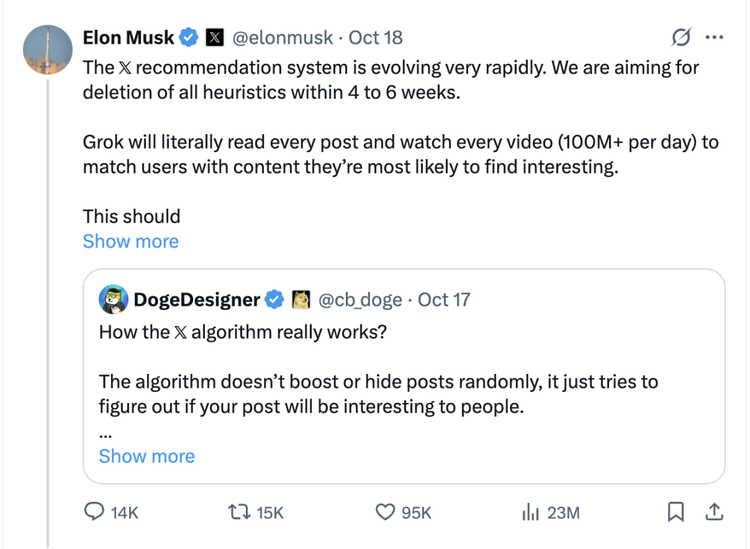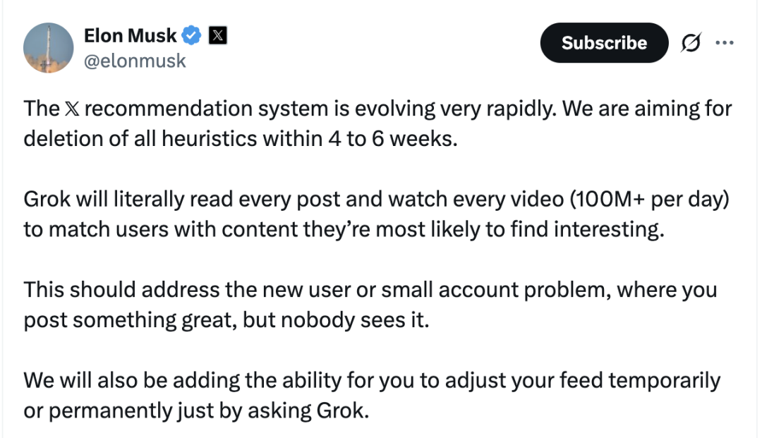 如果计划成真,X 将成为首个完全抛弃启发式算法的大型社交平台。这一手更新,直接让 Grok 从无情的总结机器罗伯特、X 上的维基百科,上位到了 X 的总管。