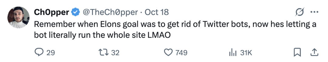 有意思的是,马斯克当初收购 X 时的目标,是清理掉机器账号,让平台回归“真实对话”。而现在,他却让 Grok 接管整个平台的信息流。