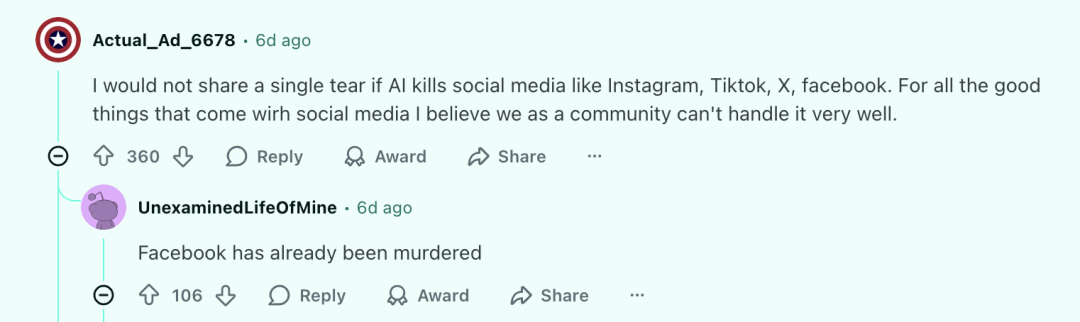与此同时,“互联网死亡理论”也在 Reddit 引发热议。互联网死亡理论认为,如今大多数网络内容都是由机器人和算法生成的,而 AI 正在终结社交媒体。