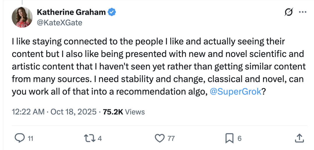 随后,马斯克在二级转发中透露了 X 推流算法的新进展:全面将启发式算法升级,由 Grok 接管 AI 推送。而且,用户还可以对 Grok 提出请求,从而动态调整内容推荐,让其更个性化。