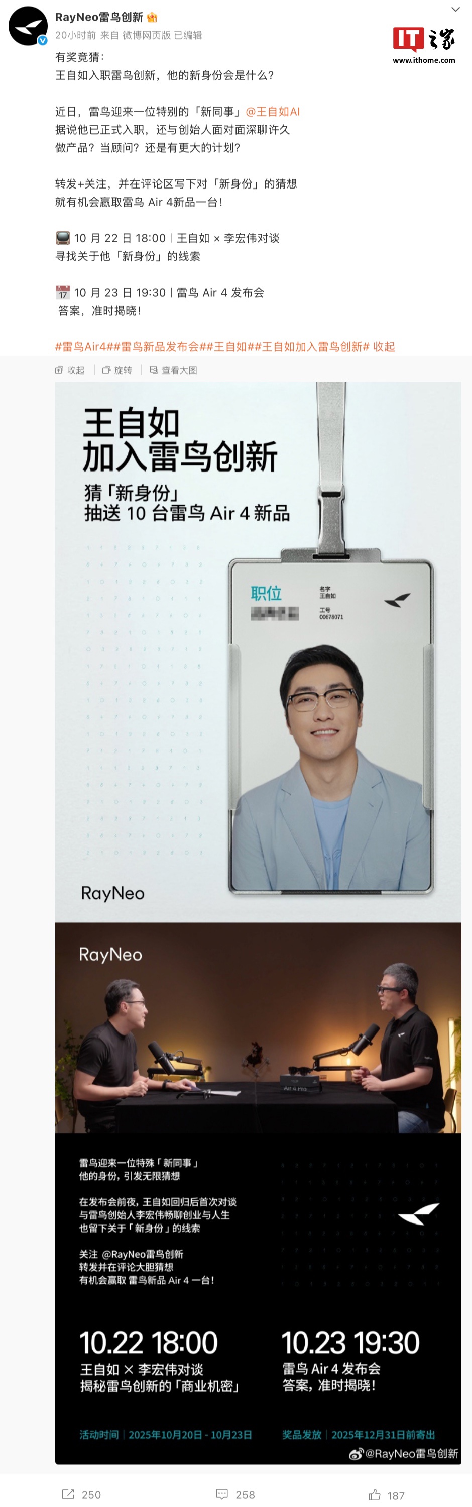 IT之家 10 月 21 日消息,AR 设备公司雷鸟创新昨晚通过其官方微博透露,王自如已正式入职该公司,官方同时公布了王自如的工牌,但相应职位信息被打码。