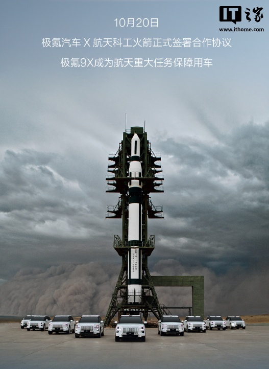 IT之家 10 月 21 日消息,极氪汽车今日宣布与航天科工火箭签约,极氪 9X 成为航天重大任务保障用车。