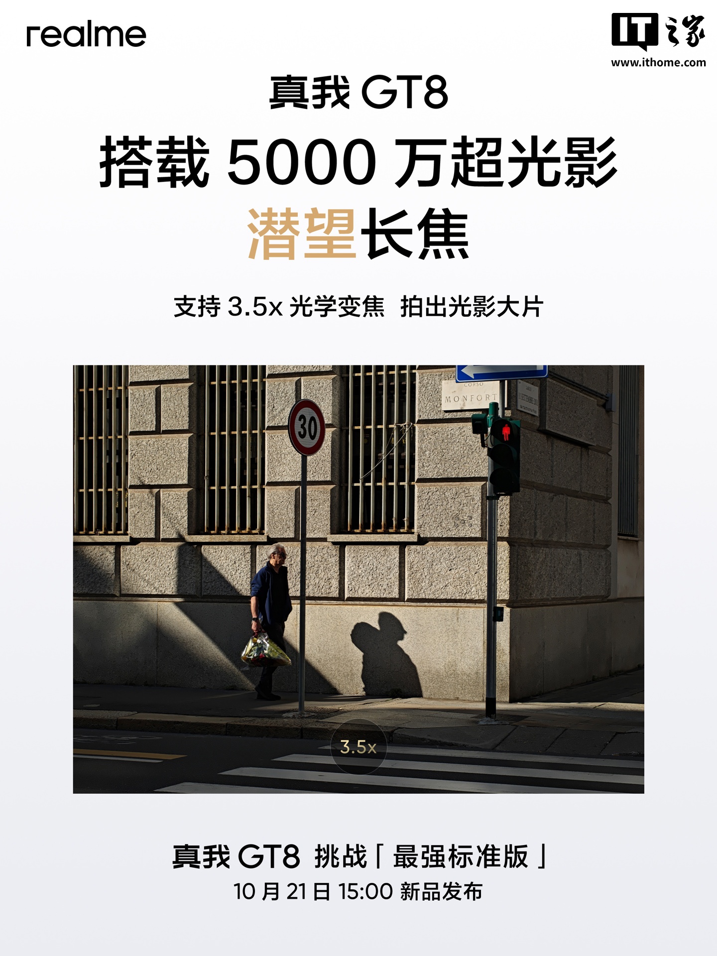 影像方面,真我 GT8 配备 5000 万超光影 OIS 潜望长焦,支持 3.5x 光学变焦;5000 万像素 OIS 主摄、800 万像素超广角;搭载 Pro 同款理光 GR 影像系统:
