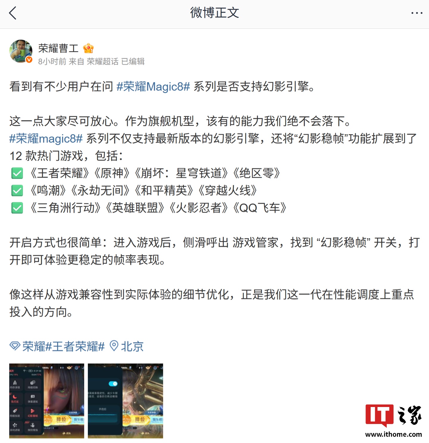 IT之家 10 月 21 日消息,荣耀研发工程师 @荣耀曹工 今日发文,解答了用户关于 Magic8 系列旗舰机是否支持幻影引擎的问题:作为旗舰机型,该有的能力绝不会落下。