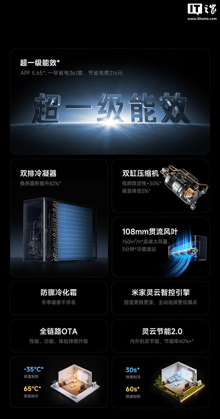 该空调内置米家灵云智控引擎,可智能检测内外机工作环境,节能率提升幅度超过 40%。同时,其具有自研全新风道,噪音低至 18dB;支持 30 秒速冷 / 60 秒速热,可在-35℃环境下制热、65℃环境下制冷。