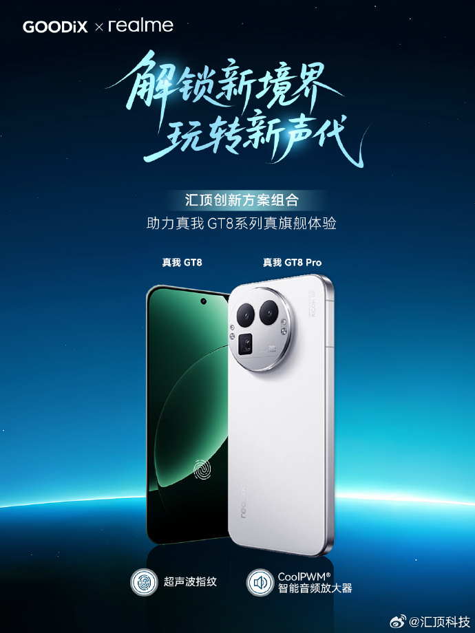 IT之家 10 月 21 日消息,realme 真我 GT8 系列手机今日发布,售价 2899 元起。发布会结束后,汇顶科技“认领”了该系列新机的创新方案组合。