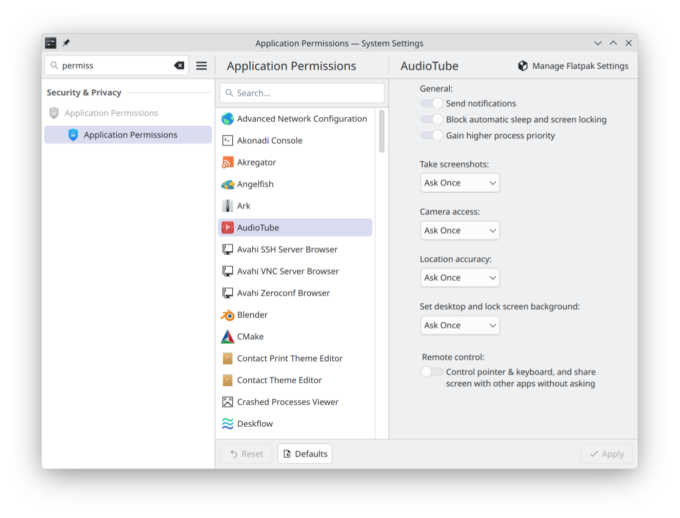 Plasma 6.5 还将原来的 Flatpak 权限设置页扩展为 “应用权限” 页面,允许用户统一管理应用的截图、远程控制等权限。RDP 远程桌面功能也得到强化,现已支持剪贴板共享,并可直接使用系统账户登录,无需单独创建远程账户。打印机工具现可在墨水或碳粉不足时提醒用户。此外,登录界面新增了 休眠功能。