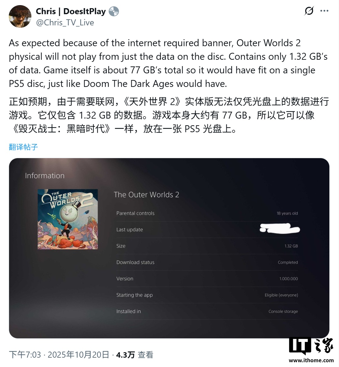 IT之家 10 月 22 日消息,消息源 @Chris_TV_Live 于 10 月 20 日在 X 平台发布推文,曝料称 PlayStation 5 版《天外世界 2》(The Outer Worlds 2)游戏光盘仅包含 1.32GB 的初始数据,玩家必须强制下载一个高达 71.6GB 的更新补丁才能启动游戏,这意味着若无网络连接,实体光盘将形同虚设。