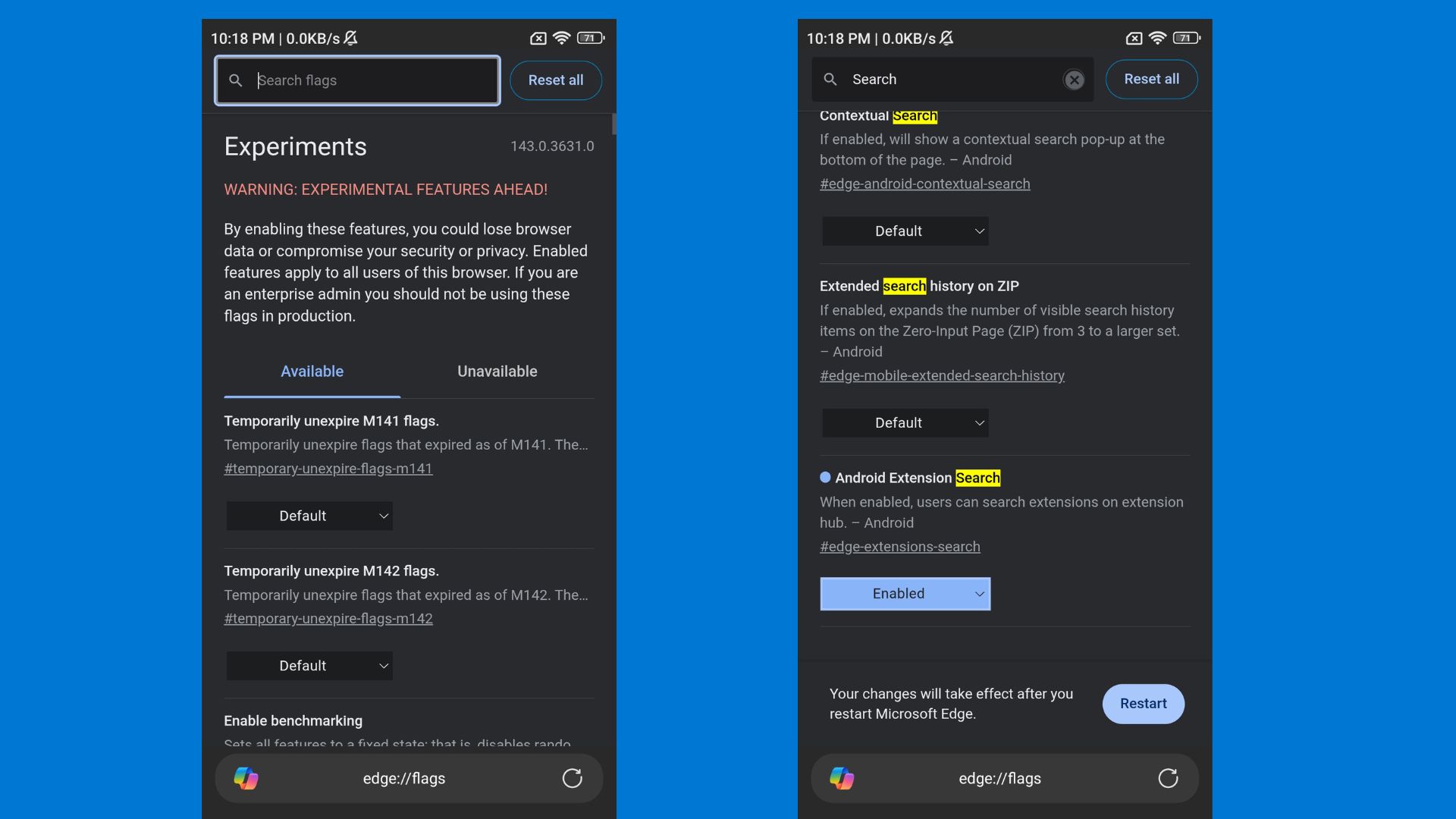 据介绍,Canary 频道的安卓版微软 Edge 浏览器现已支持桌面版扩展程序,不过该功能目前处于默认关闭状态,需要用户在 edge://flags 菜单中找到“Android Extension Search”标签,手动启用后重启浏览器即可生效。