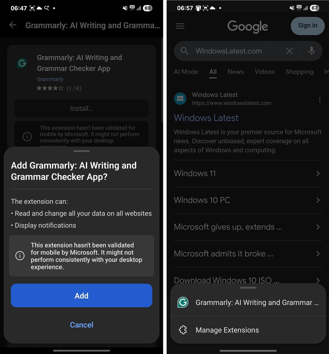 不过启用功能后的 Edge 浏览器看起来没什么不同,打开扩展程序商店后也看不到专门的分类,只有在手动搜索应用后并安装才能看到端倪,当用户点击安装时,会弹出提示“该扩展尚未在移动设备上测试,可能会有兼容性问题”。