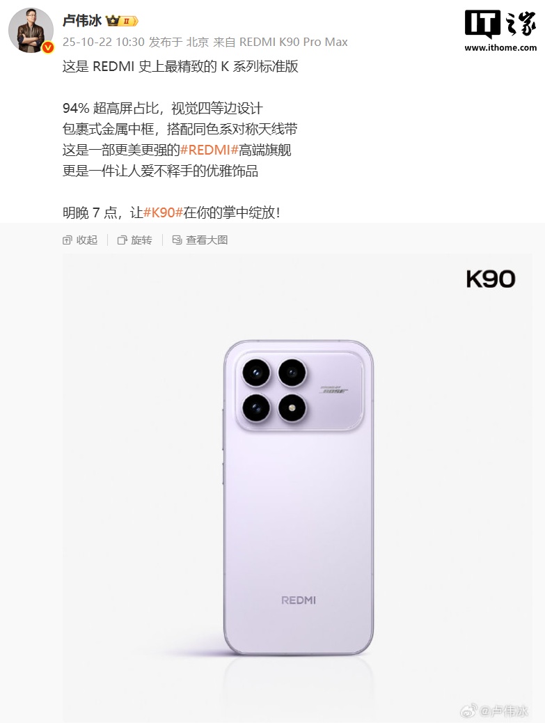 IT之家 10 月 22 日消息,小米集团合伙人、总裁,手机部总裁,小米品牌总经理卢伟冰今天发布微博,公布 REDMI K90 标准版手机的外观细节。