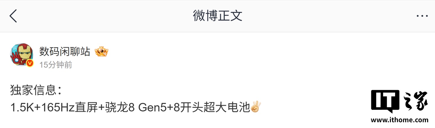 IT之家 10 月 22 日消息,博主 @数码闲聊站 今天在微博透露了某厂骁龙 8 Gen5 新机的最新情报。