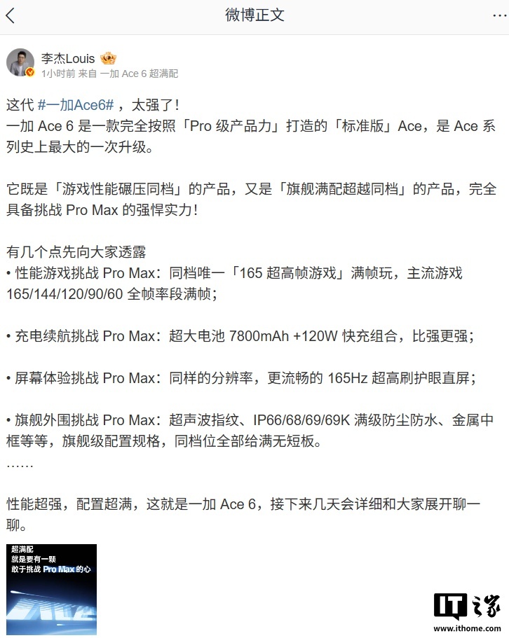 结合IT之家此前援引一加官方和李杰消息,一加 Ace 6 手机将提供快银、闪白、竞黑三种配色,搭载 165Hz 直屏,主流游戏 165/144/120/90/60 全帧率段满帧,配备 7800mAh 电池和 120W 快充,支持超声波指纹解锁。