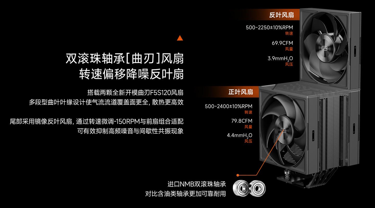 该塔式风冷采用推挽式风扇组合,两颗 12025 规格双滚珠轴承风扇一正叶、一反叶,150RPM 的转速差可避免产生共振。